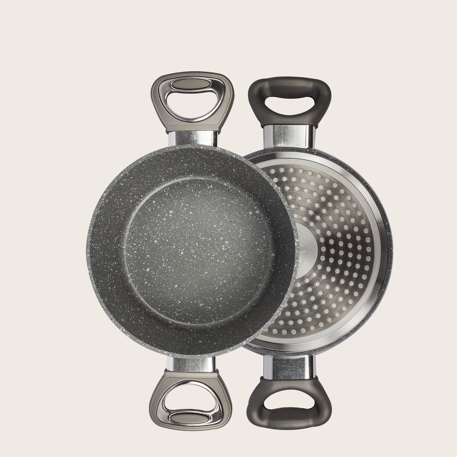 Disponibile in quattro dimensioni, per le esigenze più diverse. Il rivestimento antiaderente simula la pietra naturale e ne riproduce le caratteristiche in cottura garantendo la massima resistenza e durata nel tempo. Adatta a tutti i fornelli, dal tradizionale all’induzione, passando per l’elettrico.