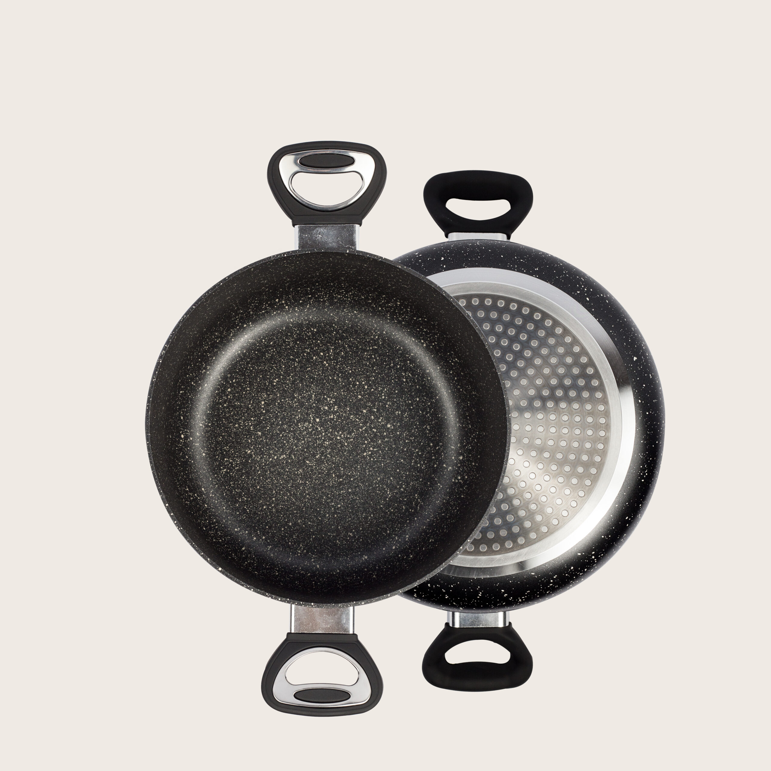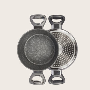 La casseruola Vulcania è disponibile in quattro dimensioni (16, 20  24 e 28 cm), per accontentare le esigenze più diverse. Il rivestimento antiaderente simula la pietra naturale e ne riproduce le caratteristiche in cottura garantendo la massima resistenza e durata nel tempo.