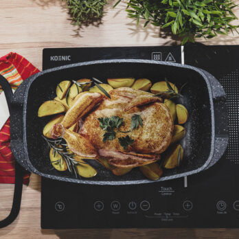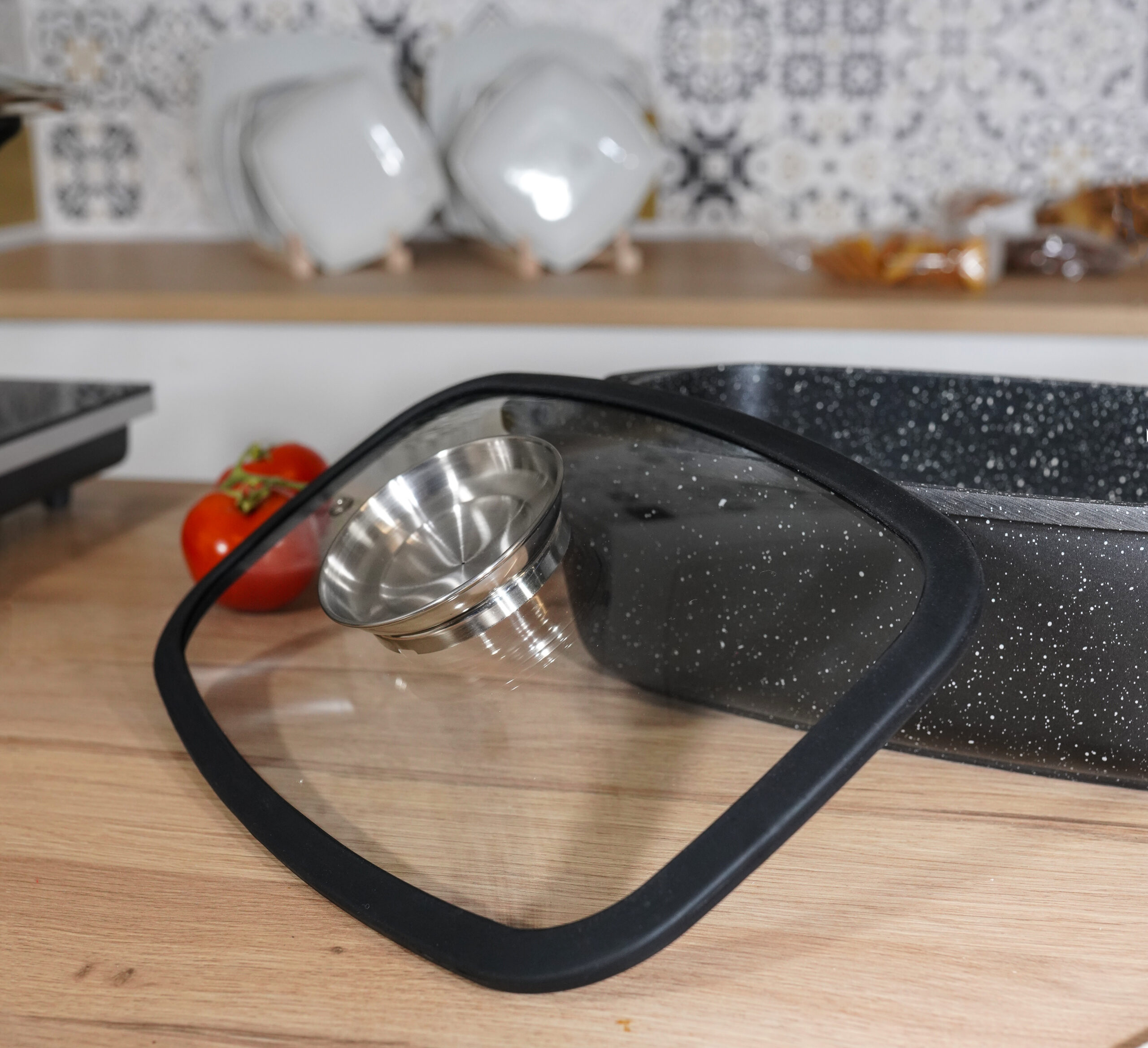 Rostiera in alluminio pressofuso, con rivestimento antiaderente rinforzato e spessore 4 mm. Adatto per cotture speciali su piani a gas e induzione. Non contiene PFOA. Lavabile in lavastoviglie. Disponibile in due misure: diametro 35 cm e diametro 32 cm.